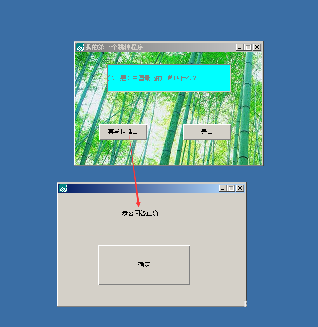 载入(窗口1,,真) 销毁() 双击泰山的按钮,输入以下代码: 载入(窗口2,,真) 销毁() 双击新建的窗口1的“确定”按钮,输入代码: 销毁() 同理双击窗口2的“确定”按钮,输入代码: 销毁()