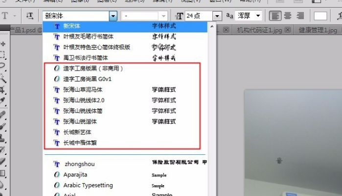这时你会发现,Photoshop的字体列表会多出很多用中文显示的中文字体名称。据我测,Photoshop好像只能智能识别一些中文字体,如:文鼎、微软、方正字体等,而汉鼎字体就不能在Photoshop的字体列表中显示出来,若是想把汉鼎字体在Photoshop字体列表中显示出来如下操作: