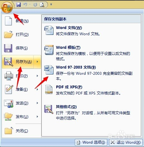 2、打开后点击左上角的office按钮,进入office的设置选项,选择另存为,然后选择另存为类型为word97-2003文档