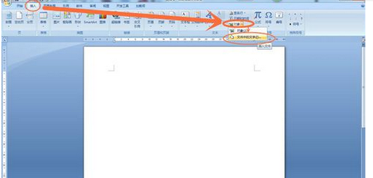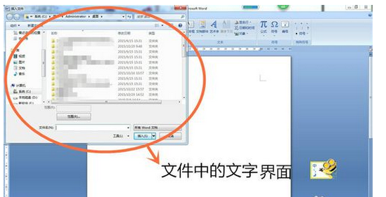 4.再次,在新建的word文档的界面的工具栏上点击“插入”,再在插入的子菜单中找到“对象”,接着,点击“对象”右下角的倒三角符号,弹出子菜单,最后选择“文件中的文字”。