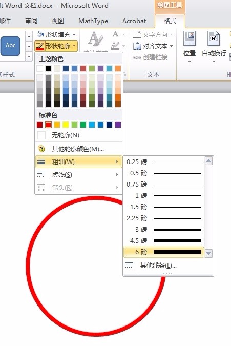 3、选中圆,然后将“形状填充”设为“无填充颜色”,将“形状轮廓”设为“红色”,再设置粗细为“6磅”。