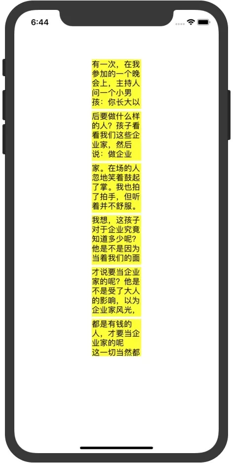 NSString *text = @"有一次,在我参加的一个晚会上,主持人问一个小男孩:你长大以后要做什么样的人?孩子看看我们这些企业家,然后说:做企业家。在场的人忽地笑着鼓起了掌。我也拍了拍手,但听着并不舒服。我想,这孩子对于企业究竟知道多少呢?他是不是因为当着我们的面才说要当企业家的呢?他是不是受了大人的影响,以为企业家风光,都是有钱的人,才要当企业家的呢\n这一切当然都是一个谜。但不管怎样,作为一个人的人生志向,我以为当什么并不重要;不管是谁,最重要的是从小要立志做一个努力的人\n我小的时候也曾有人问过同样的问题,我的回答不外乎当教师、解放军和科学家之类。时光一晃流走了二十多年,当年的孩子,如今已是四十出头的大人。但仔细想一想,当年我在大人们跟前表白过的志向,实际一个也没有实现。我身边的其他人差不多也是如此。有的想当教师,后来却成了个体户;想当解放军的,有人竟做了囚犯。我上大学时有两个同窗好友,他们现在都是我国电子行业里才华出众的人,一个成长为“康佳”集团的老总,一个领导着TCL集团。我们三个不期而然地成为中国彩电骨干企业的经营者,可是当年大学毕业时,无论有多大的想像力,我们也不敢想十几年后会成现在的样子。一切都是我们在奋斗中见机行事,一步一步努力得来的。与其说我们是有理想的人,不如说我们是一直在努力的人。\n并非我们不重视理想,而是因为树雄心壮志易,为理想努力难,人生自古就如此。有谁会想到,十多年前的今天,我曾是一个在街头彷徨,为生存犯愁的人?当时的我,一无所有,前途渺茫,真不知路在何处。然而,我却没有灰心失望,回想起来,支撑着我走过这段坎坷岁月的正是我的意志品格。当许多人以为我已不行、该不行了的时候,我仍做着从地上爬起来的努力,我坚信人生就像马拉多纳踢球,往往是在快要倒下去的时候“进球”获得生机的。事实也正是如此,就在“山重水复疑无路”的时候,香港一家企业倒闭给了我东山再起的机会,使我能够与掌握世界最新技术的英国科技人员合作,开发技术先进的彩色电视机,从此一举走出困境。\n有人说,“努力”与“拥有”是人生一左一右的两道风景。但我以为,人生最美最不能逊色的风景应该是努力。努力是人生的一种精神状态,是对生命的一种赤子之情。努力是拥有之母,拥有是努力之子。一心努力可谓条条大路通罗马,只想获取可谓道路逼仄,天地窄小。所以,与其规定自己一定要成为一个什么样的人物,获得什么东西,不如磨练自己做一个努力的人。志向再高,没有努力,志向终难坚守;没有远大目标,因为努力,终会找到奋斗的方向。做一个努力的人,可以说是人生最切实际的目标,是人生最大的境界。\n许多人因为给自己定的目标太高太功利,因为难以成功而变得灰头土脸,最终灰心失望。究其原因,往往就是因为太关注拥有,而忽略做一个努力的人。对于今天的孩子们,如果只关注他们将来该做个什么样的人物,不把意志品质作为一个做人的目标提出来,最终我们只能培养出狭隘、自私、脆弱和境界不高的人。遗憾的是,我们在这方面做得并不尽如人意。";