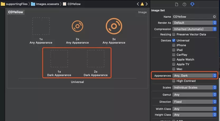 打开图片资源管理库 Assets.xcassets,选中需要适配的图片素材item,打开最右侧的 Inspectors 工具栏,找到 Appearances 选项,并设置为 Any, Dark模式,此时会在item下增加Dark Appearance,将黑暗模式下的素材拖入即可。关于黑暗模式图片资源的加载,与正常加载图片方法一致。