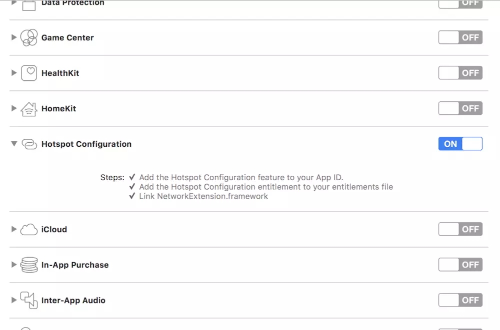 Xcode - Capabilities - Hostpot Configuration 勾选