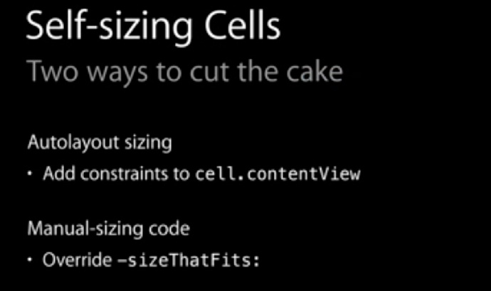 回到正题,iOS8 WWDC 中推出了 self-sizing cell 的概念,旨在让 cell 自己负责自己的高度计算,使用 frame layout 和 auto layout 都可以享受到: