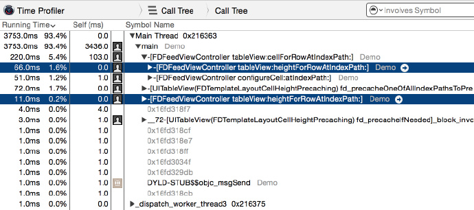 一个有 54 个内容和高度不同 cell 的 table view,从头滑动到尾,再从尾滑动到头,iOS8 系统下,iPhone6,使用 Time Profiler 监测算高函数所花费的时间: