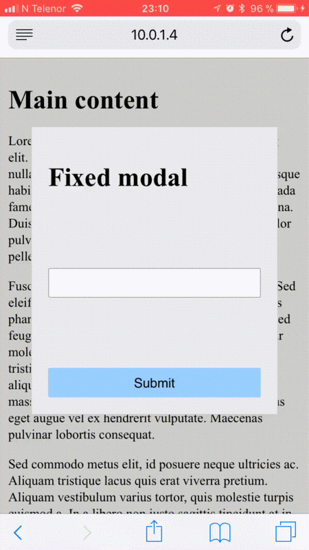 具体情况:弹出层使用position: fixed;弹出层内附带input/textarea输入框,ios11系统的苹果机用户在点击输入框,出现键盘后,弹出层被顶上去,而光标还停留在原处,即出现错位情况。