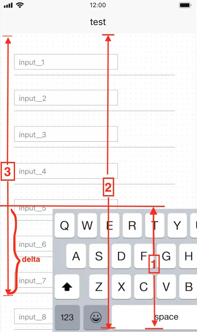 那么这里我们就要计算一下需要向上移动的距离delta=3-(2-1),2是list的高度,1是键盘的高度,3是第7个输入框所在cell的maxY值-当前list的contentoffset的y值,如图3,