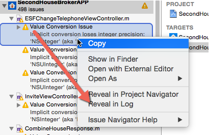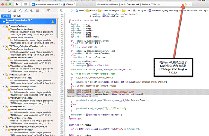 再重新编译,哈哈,整个文件中的 Implicit conversion loses integer precision: 'NSInteger' (aka 'long') to 'int32_t' (aka 'int') 警告全部消失了!!!!