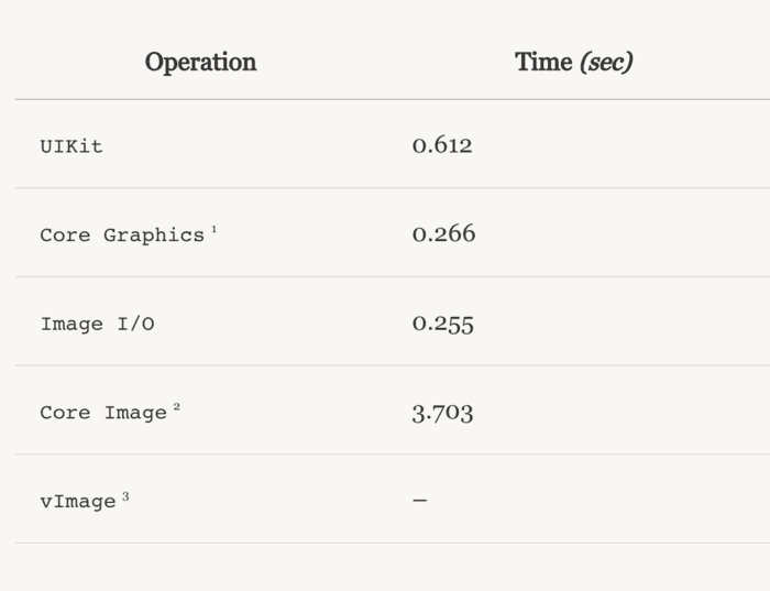 通过上面测试可以看到Core Image表现最差。Core Graphics 和 Image I/O最好。实际上,在苹果官方在 Performance Best Practices section of the Core Image Programming Guide 部分中特别推荐使用Core Graphics或Image I / O功能预先裁剪或缩小图像。