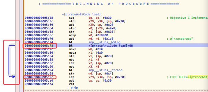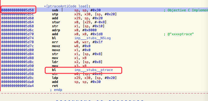 复制ptrace下一条指令0000000000005d94 bl imp___stubs__ptrace,点击bl __NSlog的下一行然后Alt+a,写入代码bl 0x 0000000000005d94