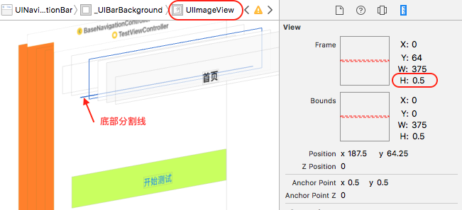 从图中可以看出,导航栏的底部分割线是一个UIImageView对象,而且高度只有0.5,所以我们可以据此获取到导航栏的底部分割线对象,在一个视图控制器中实现此需求,代码如下:
