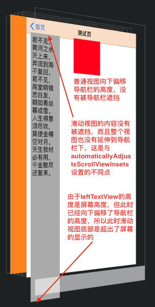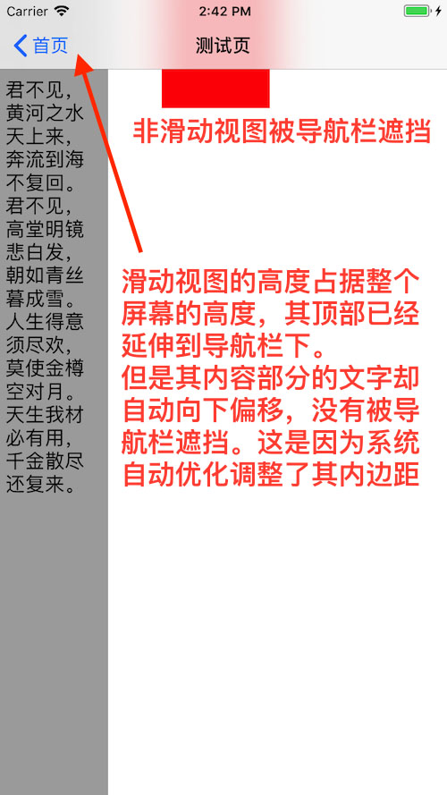 //UITextView是滑动视图,内容自动向下偏移,不会被导航栏覆盖 UITextView *leftTextView = [[UITextView alloc] init]; leftTextView.frame = CGRectMake(0, 0,100, kDeviceHeight); // leftTextView.backgroundColor = [UIColor lightGrayColor]; leftTextView.text = @"君不见,黄河之水天上来,奔流到海不复回。君不见,高堂明镜悲白发,朝如青丝暮成雪。人生得意须尽欢,莫使金樽空对月。天生我材必有用,千金散尽还复来。"; leftTextView.font = [UIFont systemFontOfSize:18]; leftTextView.editable = NO; [self.view addSubview:leftTextView]; //UIView是非滑动视图,内容被导航栏部分覆盖 UIView *rightView= [[UIView alloc] initWithFrame:CGRectMake(150, 0, 100, 100)]; rightView.backgroundColor = [UIColor redColor]; [self.view addSubview:rightView];