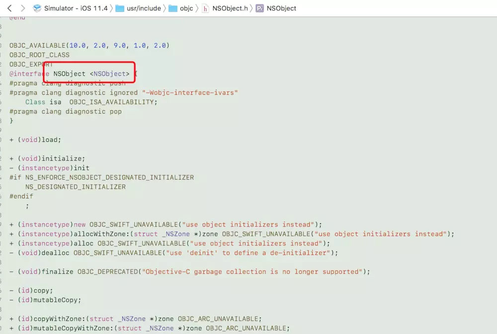 事实上,从NSObject类的定义可知,NSObject的类本身就遵循NSObject协议,如下图所示。