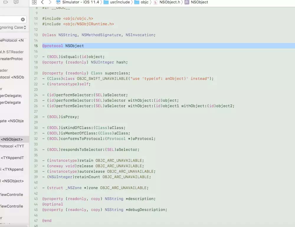 但是,NSObject不仅仅代表基类,还有协议的意思,我们可以称之根协议,例如下图所示:
