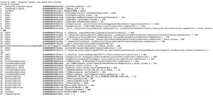 Exception Type: EXC_BAD_ACCESS (SIGSEGV) Thread 0 name: Dispatch queue: com.apple.main-thread Thread 0 Crashed: 0 testNull 0x000000010494aacc 0x104944000 + 27340 1 testNull 0x000000010494aac8 0x104944000 + 27336 2 testNull 0x000000010494a6b0 0x104944000 + 26288 3 UIKit 0x000000018cec4efc -[UIViewController loadViewIfRequired] + 1040 4 UIKit 0x000000018cec4ad4 -[UIViewController view] + 28 5 UIKit 0x000000018cecb6a0 -[UIWindow addRootViewControllerViewIfPossible] + 136 6 UIKit 0x000000018cec890c -[UIWindow _setHidden:forced:] + 272 7 UIKit 0x000000018cf379ec -[UIWindow makeKeyAndVisible] + 48