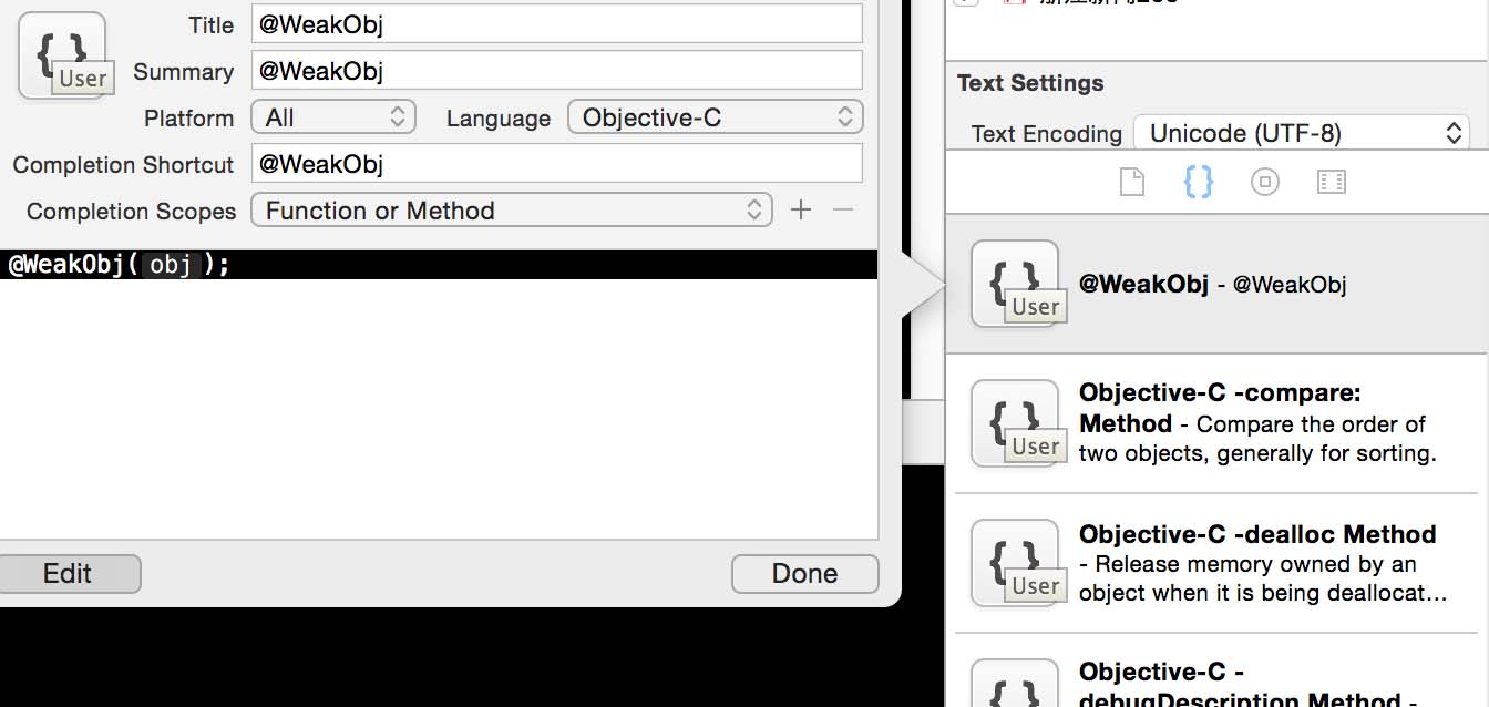 拖到Xcode的CodeSnippet区域,快捷键设置为@WeakObj即可。