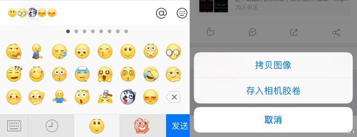 接下来看一下微博国际版,国际版调起表情键盘时是有光标的,是一个"真正的"键盘,但是想要拖拽光标的时候,很大概率上会触发到保存图片的行为(如下图所示),导致根本没办法拖动光标。