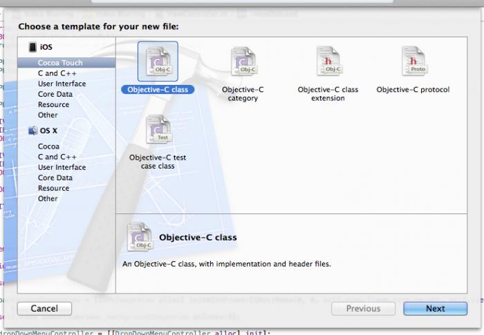 打开File/New/File…,然后选择iOS/Cocoa Touch/Objective-C class,如下所示: