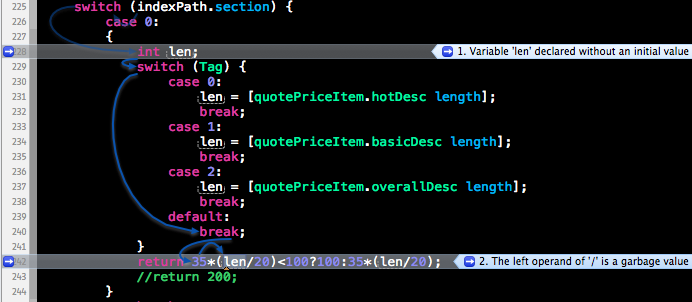 Analyze还给出了箭头提示:len is a?garbage value。建议在声明变量时,同时进行初始化。