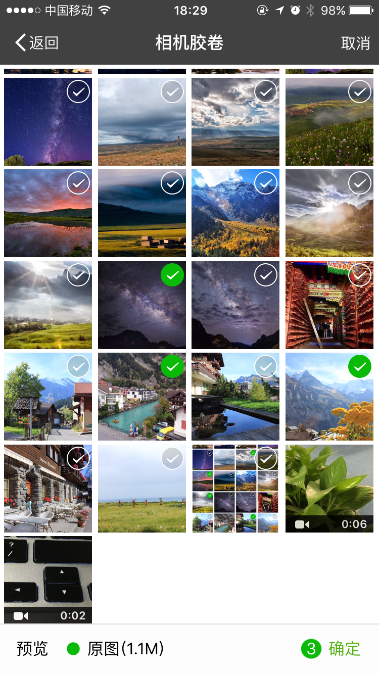 小缺点2:在照片选择器页,微信的设计是不允许同时选择视频和照片的,但是在照片预览页面,用户却可以同时选中视频和照片,此时微信会默认将视频作为图片发送,而没有做一个提示。并且,如果用户选择了发送原图,此时视频虽然也被选中出来了,但是会一直发送失败。