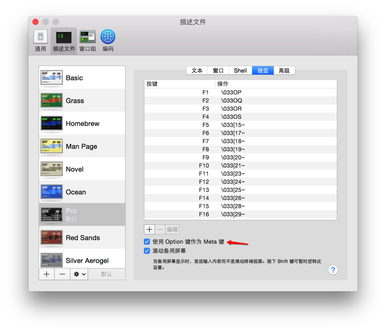Mac的终端有一个很关键的配置,就是“使用 Option 键作为 Meta 键”。勾上这个选项之后,就可以使用Emacs的编辑命令了。