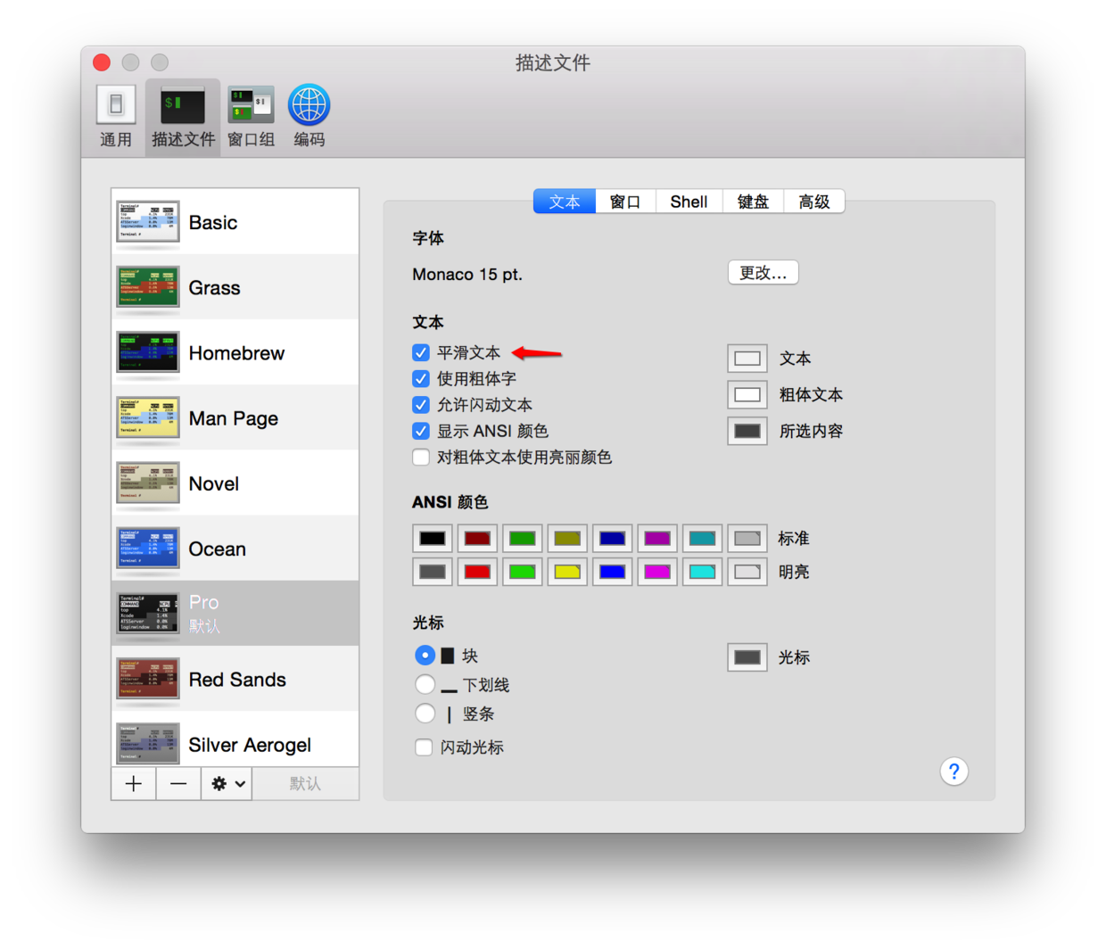我发现有些人的终端没有设置“平滑文本”,导致终端上的文字很难看。赶紧把这个选项勾上吧。
