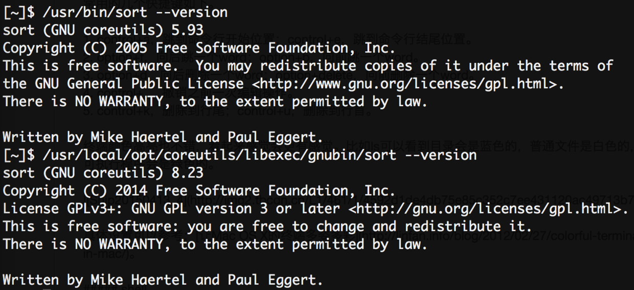 GNU Coreutils包含了各种GNU好用的工具。根据我的观察,我发现Mac预装了Coreutils,只是版本比较低,建议自己安装一下,否者sort连”-h”参数都没有。具体安装和配置的方法在让Mac OS X的终端多姿多彩这篇文章里面也有。