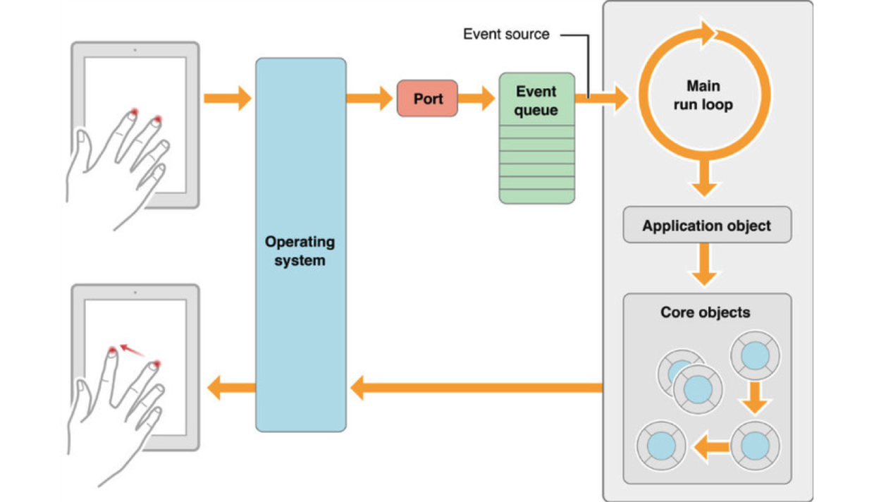 重点是UIApplicationMain() 函数,这个方法会为main thread 设置一个NSRunLoop 对象,这就解释了本文开始说的为什么我们的应用可以在无人操作的时候休息,需要让它干活的时候又能立马响应。