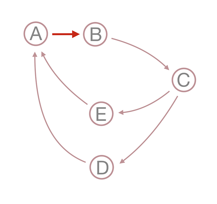 在环中,A→B是一个坏连接,创建了两个环:A-B-C-D 和 A-B-C-E。