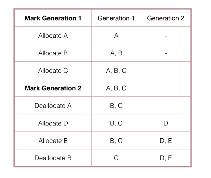 使用FBMemoryProfiler的界面,我们可以标记生成,例如,分配三个对象。然后我们标记另一个生成,之后继续分配对象。第一个生成包含我们一开始的三个对象。如果任意一个对象被释放了,它会从我们第二个生成中移除。