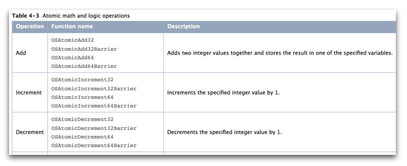 大部分的Atomic Operation都有OSAtomicXXX,OSAtomicXXXBarrier两个版本,Barrier就是前面提到的memory barrier,在多线程多个变量之间存在依赖的时候使用Barrier的版本,能够保证正确的依赖顺序。