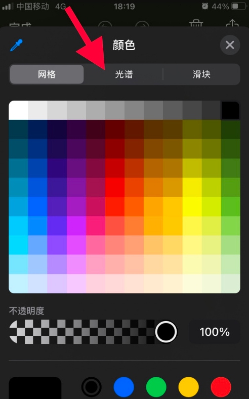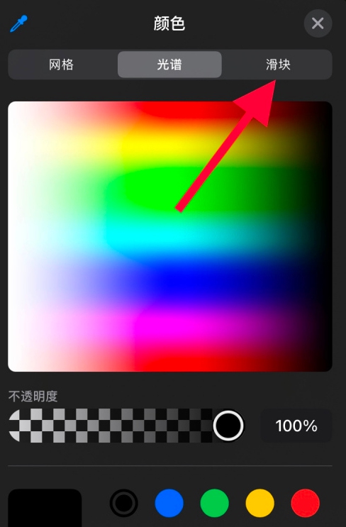 3、接着显示如下所示的界面,通过点击光谱上的颜色点来设置颜色,然后再点击“滑块”页签