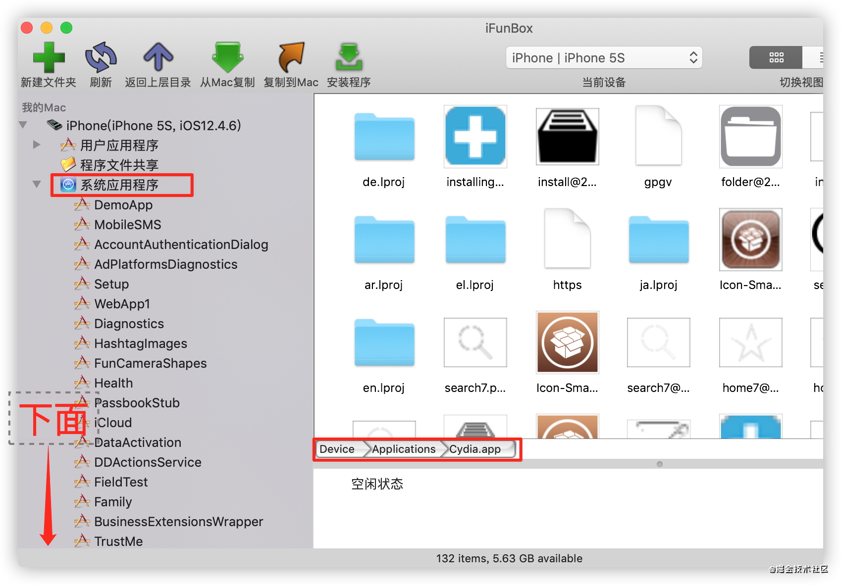 iFunBox,在左上角如果显示未越狱,那么需要在Cydia安装【Apple File Conduit "2"】之后才会显示越狱,下面有安装前后的对比图。