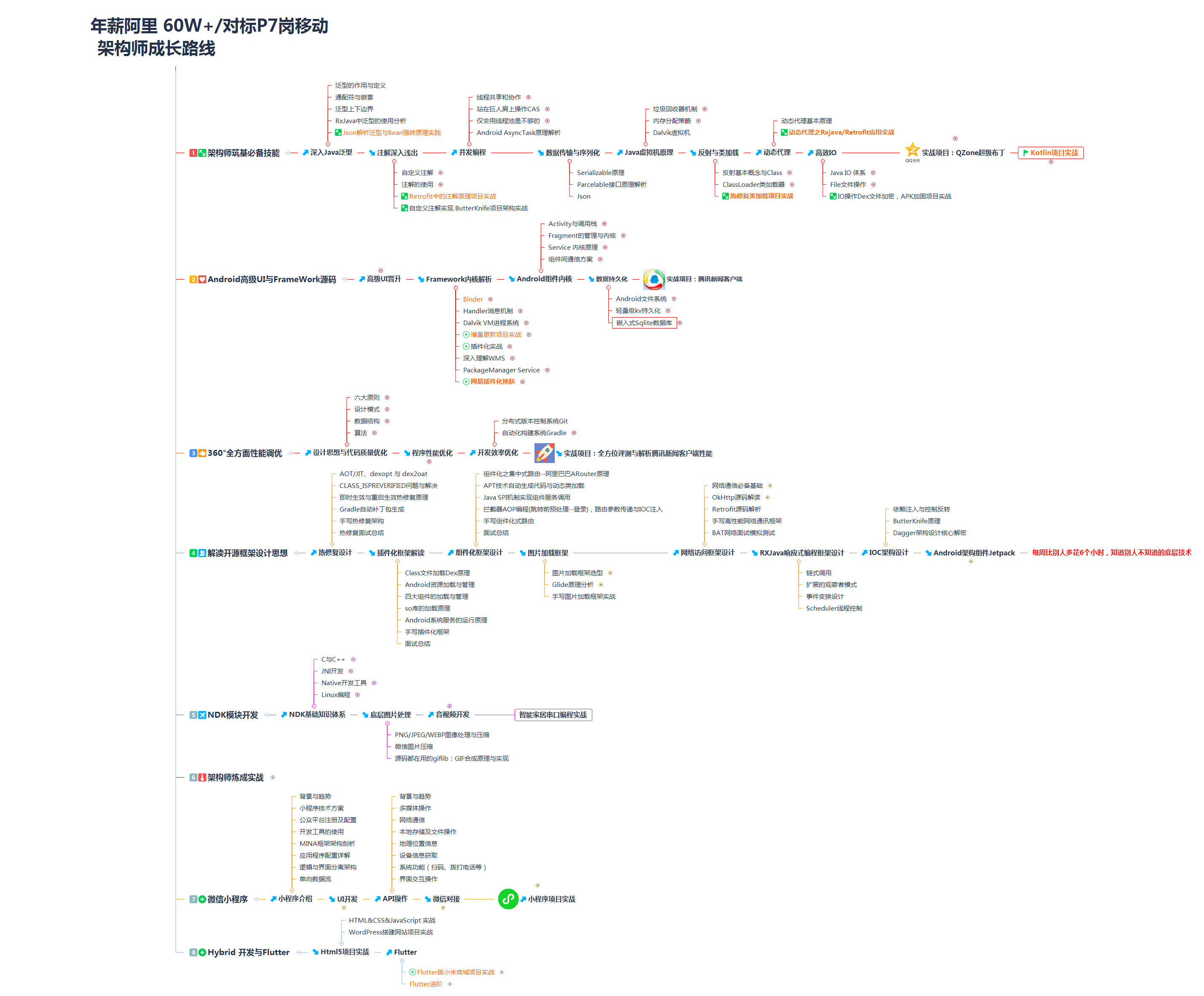 这里我结合一些移动端金字塔顶端职位(技术经理、架构师、负责人)的要求,整理出值得我们重点学习的十点。