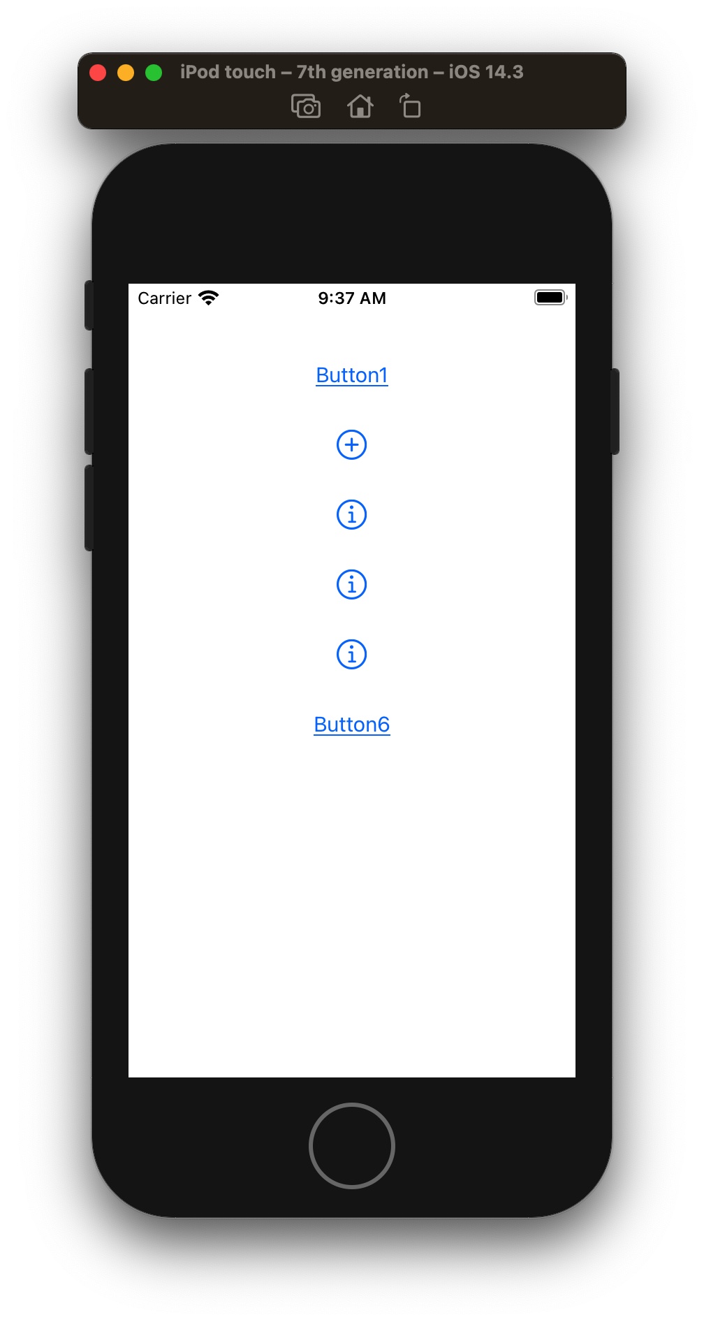 在viewDidLoad方法中依次创建了六种UIButton按钮,并给第一个和最后一个按钮设置了title标题属性