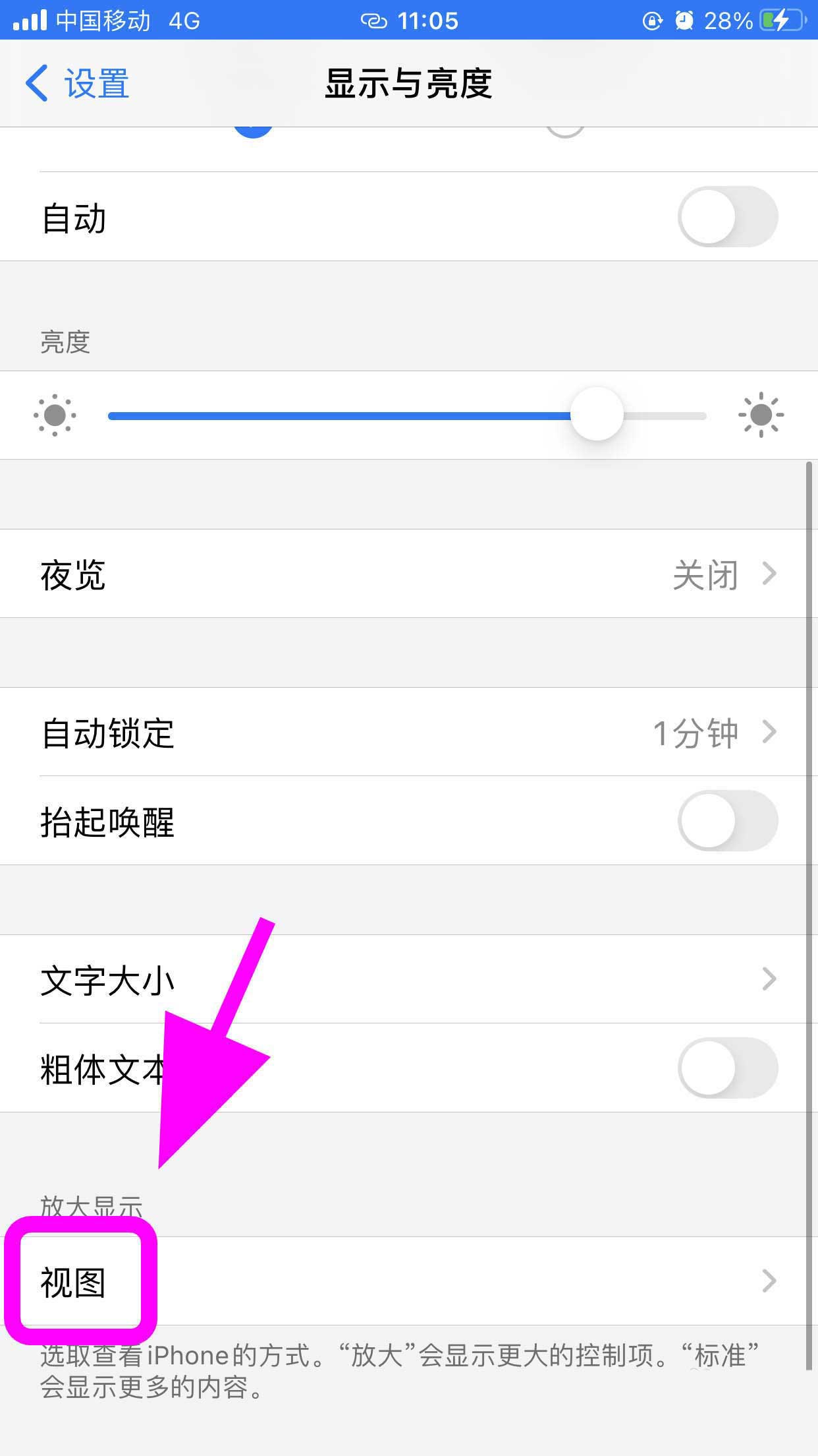 3、进入显示与亮度设置页面,上滑屏幕,在底部找到并点击【视图】;