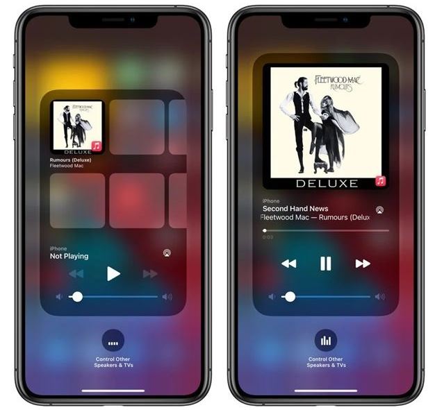 本次更新还重新设计了控制中心的 “正在播放”小部件。该部件列出了最近播放专辑,用户可能想在没有音乐播放的情况下点击并收听这些专辑。此外,airplay 也拥有重新设计的界面,可以更轻松地在多个启用了 airplay 的设备上播放音乐。