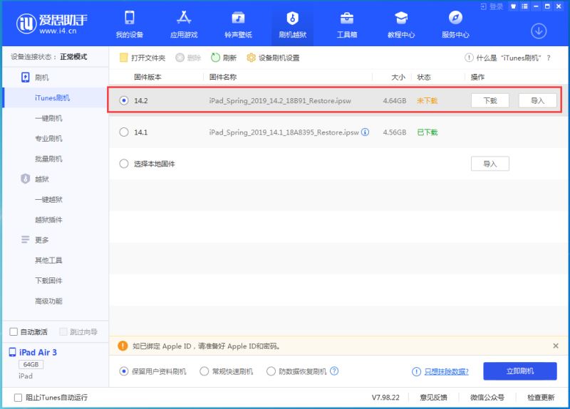 1.首先下载安装最新版爱思助手,用数据线把移动设备连接到电脑;点击上方“刷机越狱”进入到“一键刷机”界面,选择 ios 14.2版本,点“立即刷机”,之后爱思助手会自动帮您下载固件并刷机;