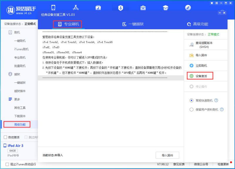 3.移动设备开机后,点“刷机越狱-高级功能”来激活,您也可以在设备上手动激活,如果是保资料刷机则无需激活。