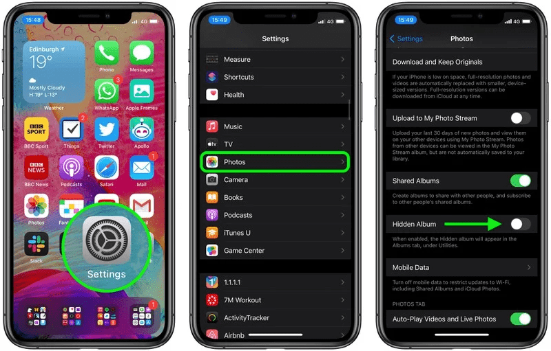 现在,隐藏的相册并将不会再显示在「照片」中,不过在其他应用选择图像时,仍会显示「已隐藏」相册。如果想让隐藏的相册出现再次出现在「照片」中,请前往「设置」-「照片」,开启「隐藏照片」旁侧的开关即可。