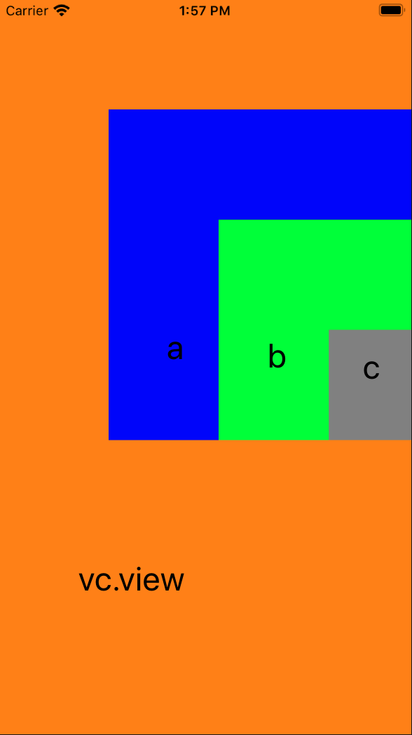 - (void)viewDidLoad { [super viewDidLoad]; self.view.backgroundColor = [UIColor orangeColor]; AView *a = [[AView alloc] initWithFrame:CGRectMake(100, 100, 300, 300)]; a.backgroundColor = [UIColor blueColor]; [self.view addSubview:a]; BView *b = [[BView alloc] initWithFrame:CGRectMake(100, 100, 200, 200)]; b.backgroundColor = [UIColor greenColor]; [a addSubview:b]; CView *c = [[CView alloc] initWithFrame:CGRectMake(100, 100, 100, 100)]; c.backgroundColor = [UIColor grayColor]; [b addSubview:c]; }