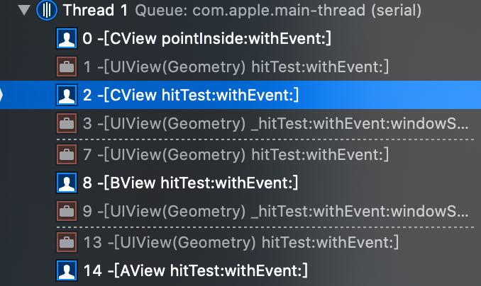 //注:AView、BViewh和CView都一样,就不重复粘贴了。 - (UIView *)hitTest:(CGPoint)point withEvent:(UIEvent *)event { NSLog(@"AView --- hitTest"); UIView * view = [super hitTest:point withEvent:event]; NSLog(@"AView --- hitTest --- return %@", view.class); return view; } - (BOOL)pointInside:(CGPoint)point withEvent:(UIEvent *)event { NSLog(@"AView --- pointInside"); return [super pointInside:point withEvent:event]; } - (void)touchesBegan:(NSSet<UITouch *> *)touches withEvent:(UIEvent *)event { NSLog(@"AView --- touchesBegan"); }