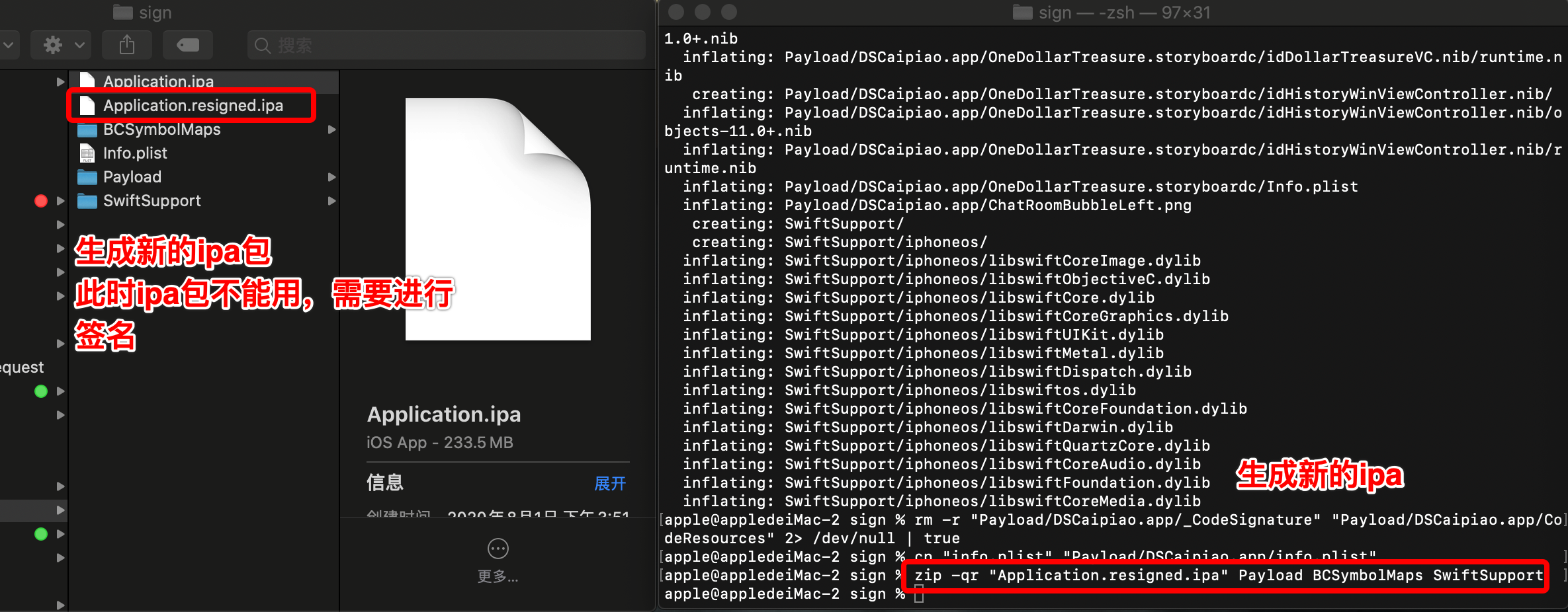 命令: zip -qr "Application.resigned.ipa" Payload