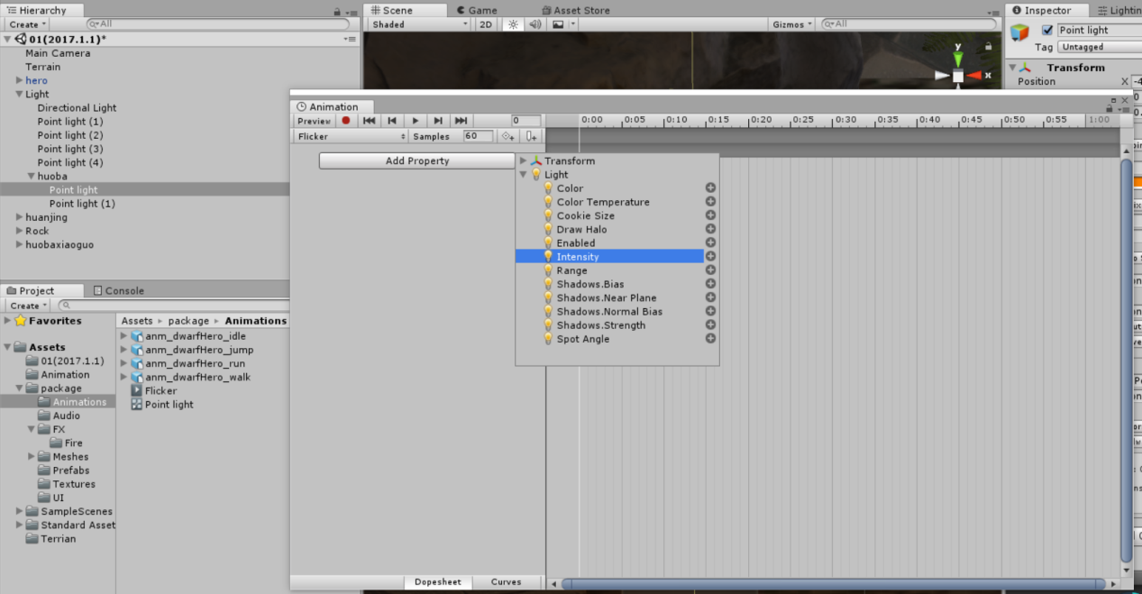 选中要控制的灯光(要选择灯光,不要选择粒子效果进行处理)—Window—Animation,弹出对话框,选择animation进行存储的位置,并且进行命名。命名结束后,点击Add Property中的强度选项,如下图所示。