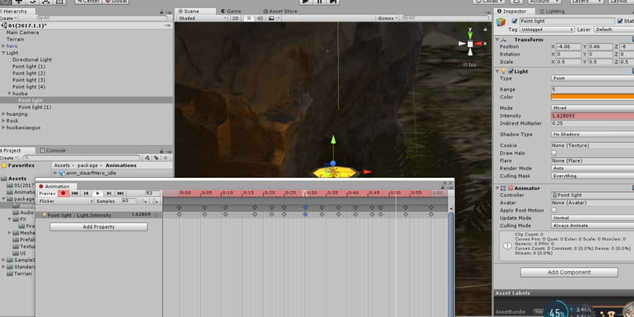 火把的添加:添加一个灯光,选择Light中的PointLight进行调整