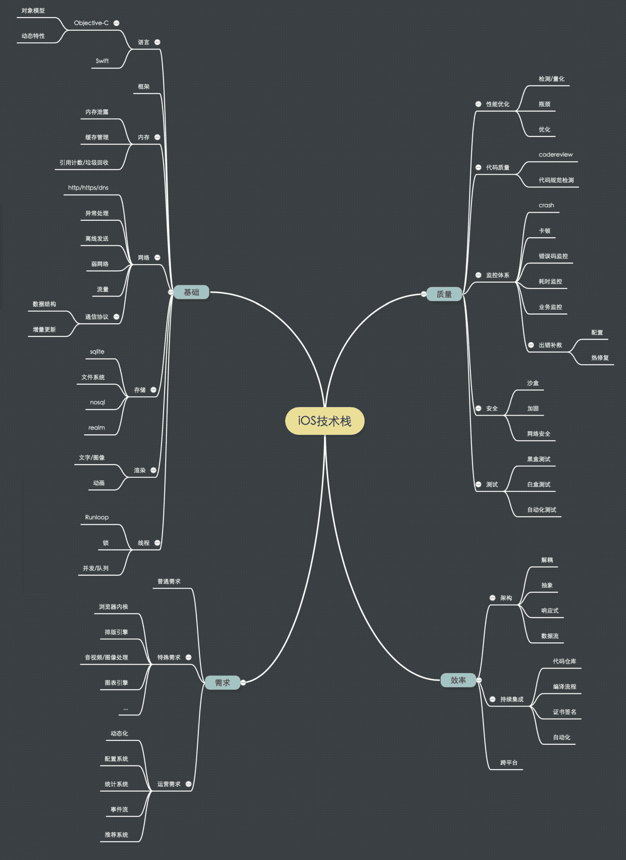这里按我的理解给 ios 相关技术分个类,以工程实现的角度,分成了基础、需求、效率、质量四个类别。基础指程序开发和 ios 开发的基础知识和技能,需求就是产品的需求,有了基础技能,实现了产品需求后,剩下的事情就都是为了提高项目质量和提升开发效率。