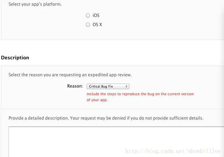 这里要注意的是理由一般是用户安全问题或者崩溃问题成功率会高一些(lz写的是崩溃,不要说我是赶时间,苹果会不同意,以前版本确实有崩溃问题,只不过不多~ 这里我不多说了,你们懂的)