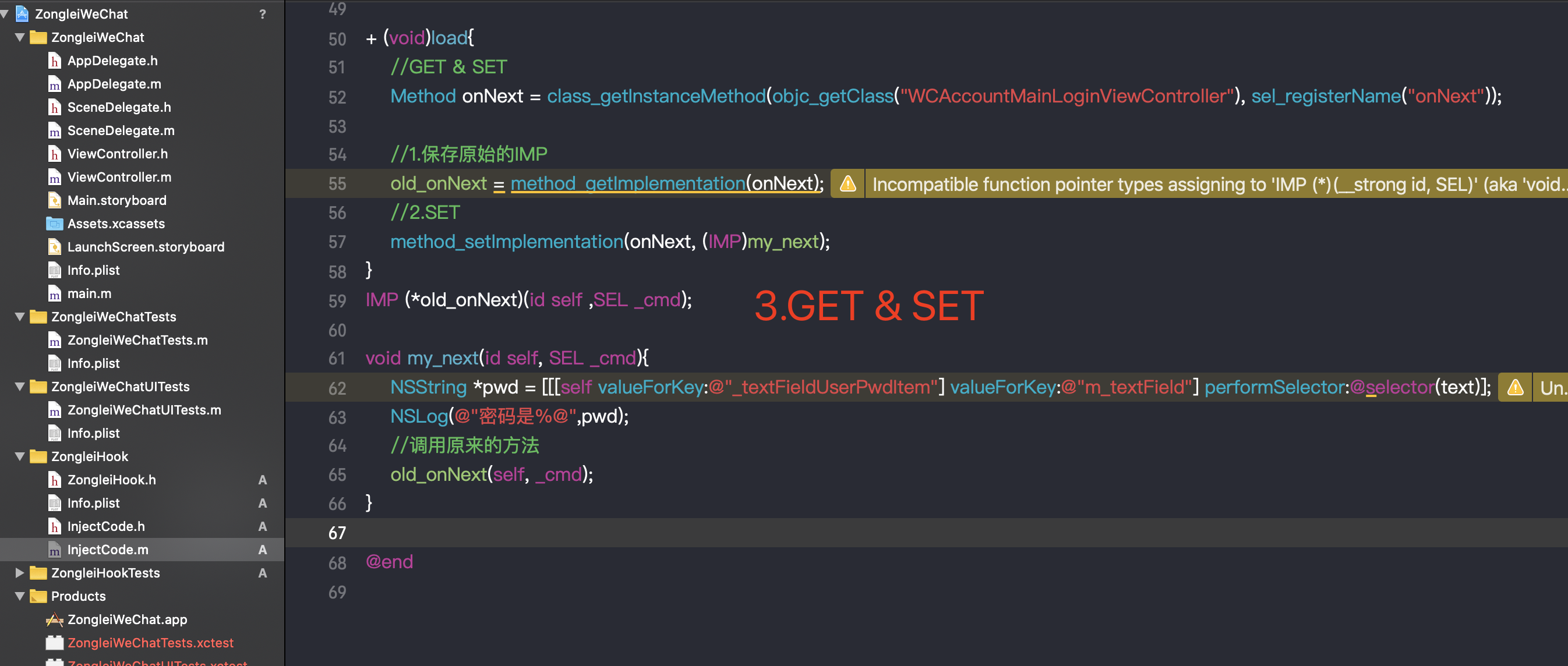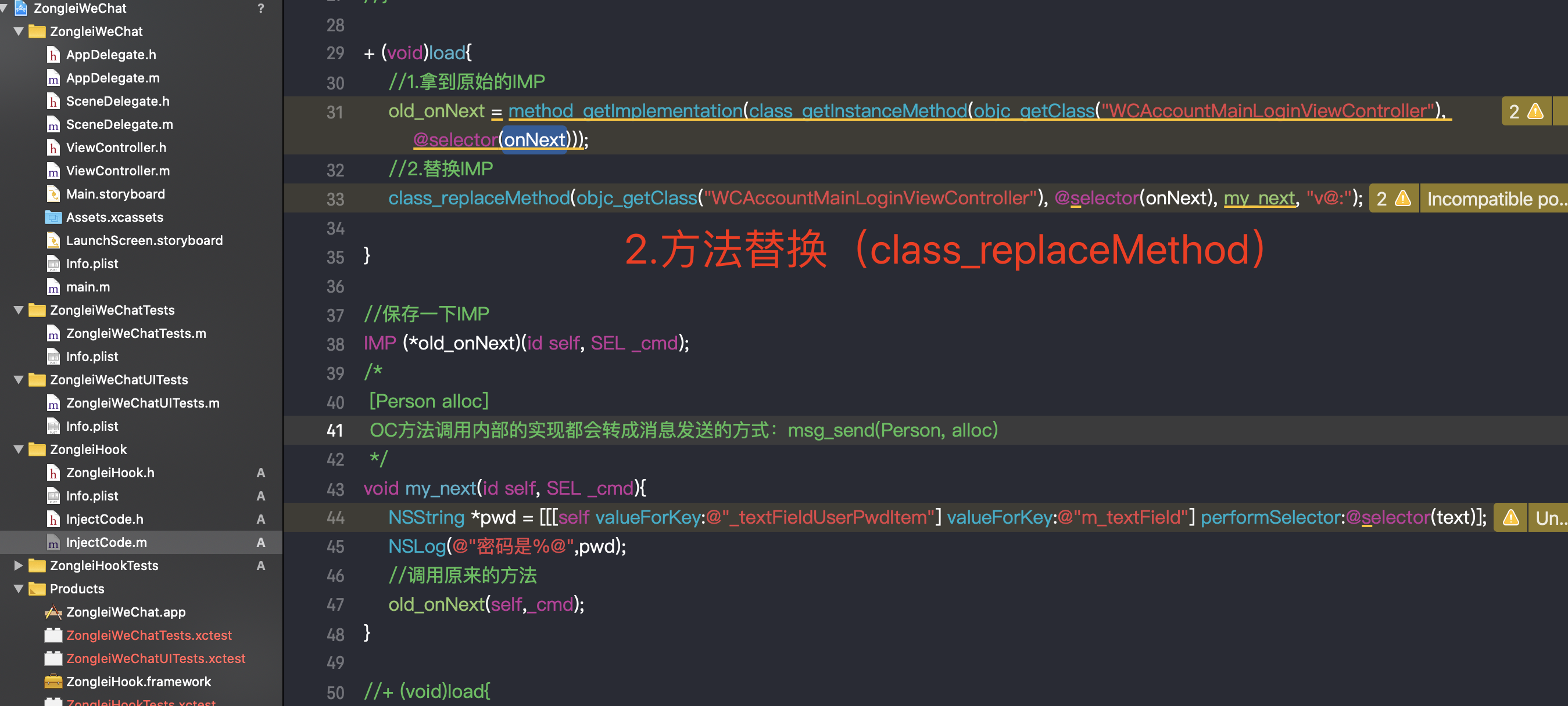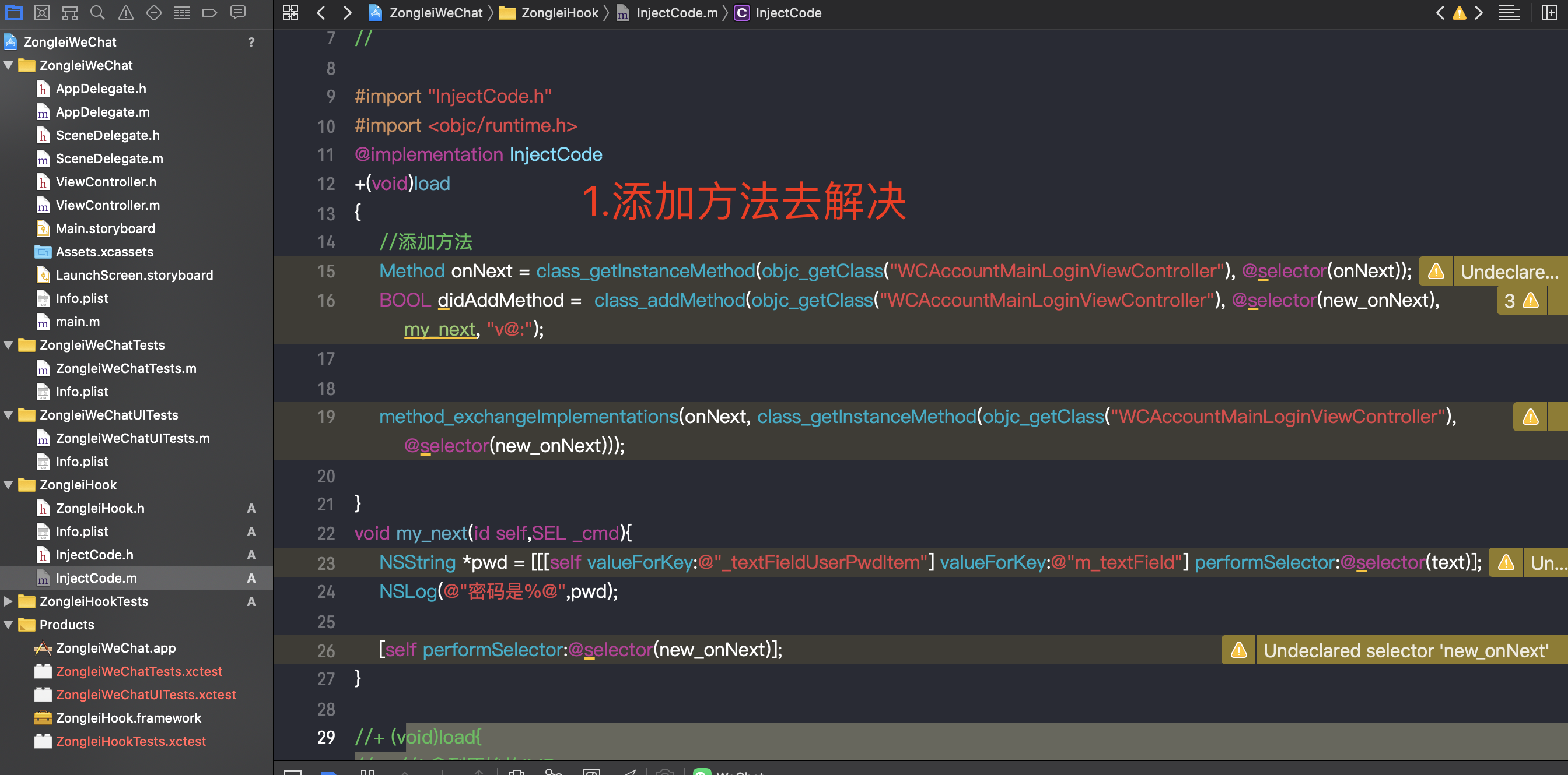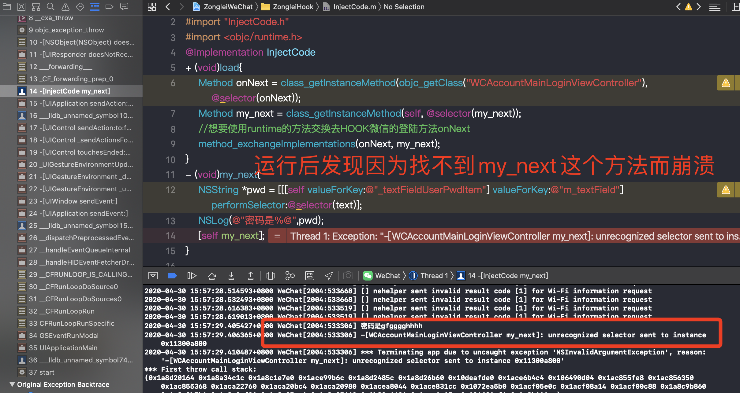 微信逆向时,想要使用runtime的方法交换去hook微信的登陆方法onnext,发现由于找不到方法而崩溃
