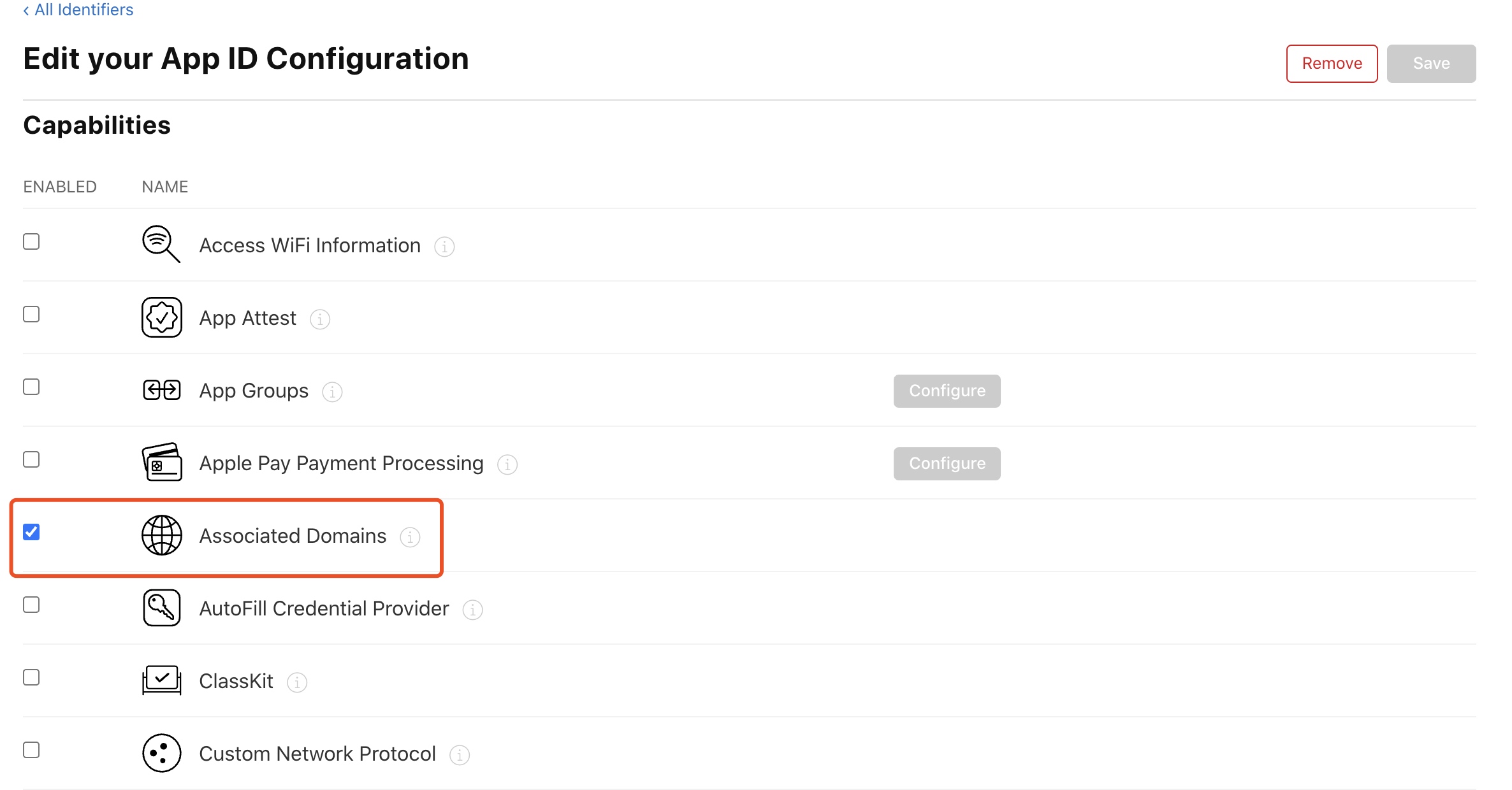 IDENTIFIER,并勾选Associated Domains